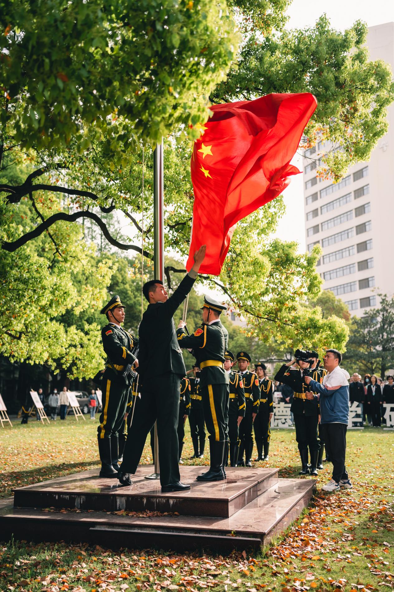 为进一步弘扬爱国主义精神,厚植爱国主义情怀,增强全民国家安全观,服装与艺术设计学院国旗护卫队党支部以全民国家安全教育日为契机,以总体国家安全观为指导,于4月12日举行“增强全民国家安全观,厚植爱国主义情怀”主题升旗仪式。副校长李炜,学生处副处长、人民武装部副部长赵彦明,学院党委书记吴晶、副书记刘雯玮,校团委和延安路校区师生代表参加。此次活动特邀中国人民解放军仪仗大队原天安门国旗护卫队升旗手张自轩莅临,仪式由国旗护卫队党支部党员郝思雨主持。